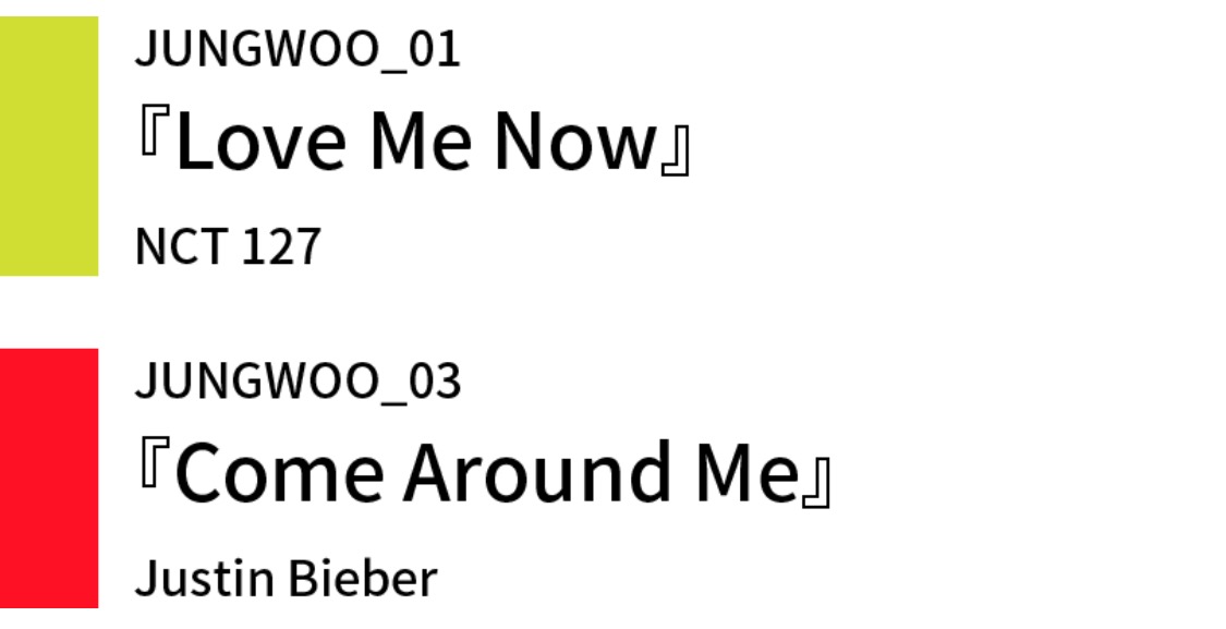 NCT 127의 여러분이 남성 논노를 위한 플레이 리스트를 만들어 주셨습니다만, 곡수도 꽤 많아졌습니다! 정우씨가 좋아하는 NCT 127의 곡과 그 외 아티스트의 곡으로, 지금 마음에 드는 것을 각각 가르쳐 주세요.